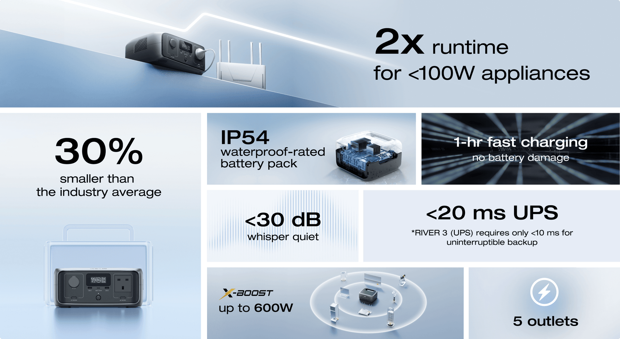 RIVER 3 hoiab 90% teie esmavajalikest seadmetest tõrgeteta töös tänu 300W väljundvõimsusele. X-Boost tehnoloogia abil suudab see toita isegi kuni 600W võimsusega seadmeid.