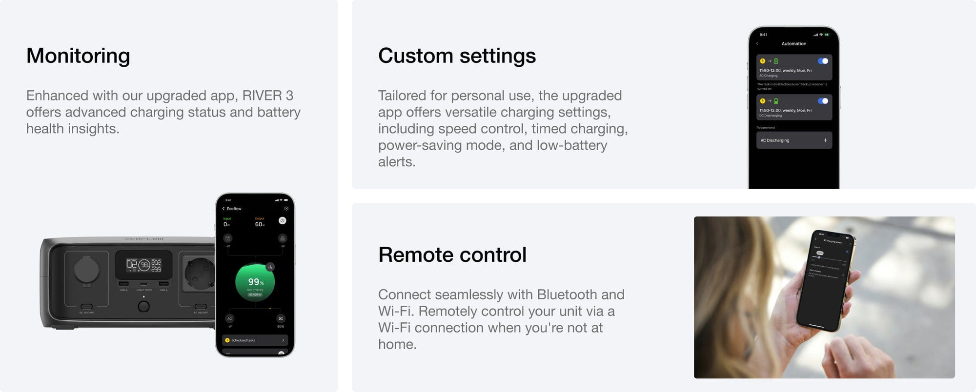 Elektrikatkestuse korral lülitub RIVER 3 vahelduvvoolu pistikupesa vaevumärgatava 20ms jooksul akutoitele. See hoiab elutähtsad seadmed töös, näiteks toiduainete säilitamiseks või turvalisuse ja side tagamiseks. Kogege sujuvat automaatset ümberlülitamist pideva meelerahu tagamiseks.