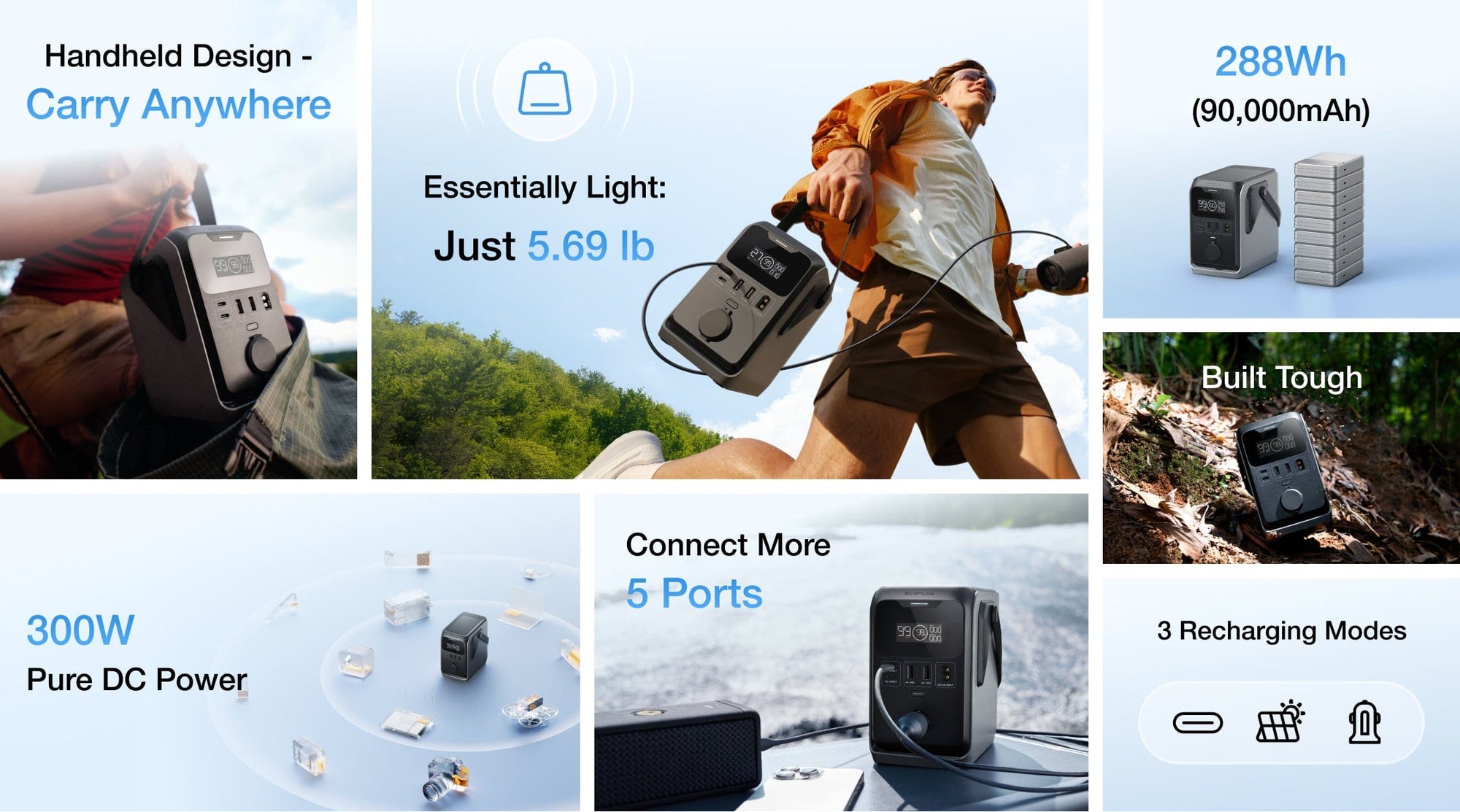 288 Wh (90 000 mAh) mahutavusega – mis vastab kuuele akupangale ühes – toidab TRAIL 300 DC vaevata kõigi su sõprade seadmeid.